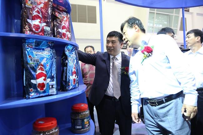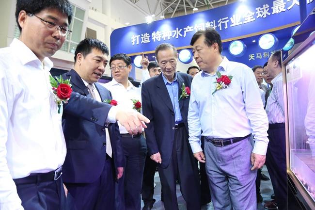 上圖為陳慶堂董事長向于康震副部長,農(nóng)業(yè)部原副部長、中國飼料工業(yè)協(xié)會顧問高鴻賓等領(lǐng)導介紹天馬科技產(chǎn)品及相關(guān)水產(chǎn)品